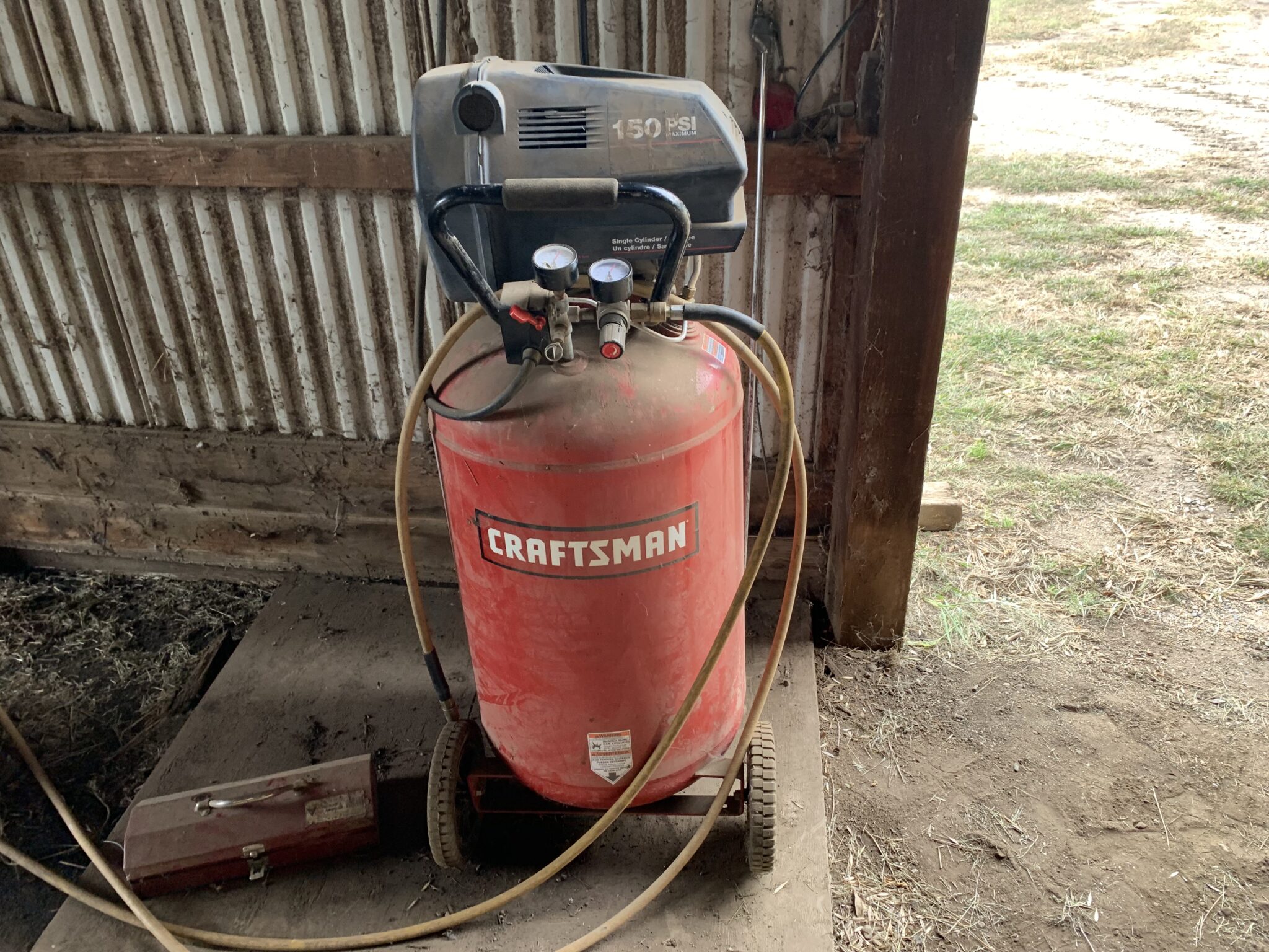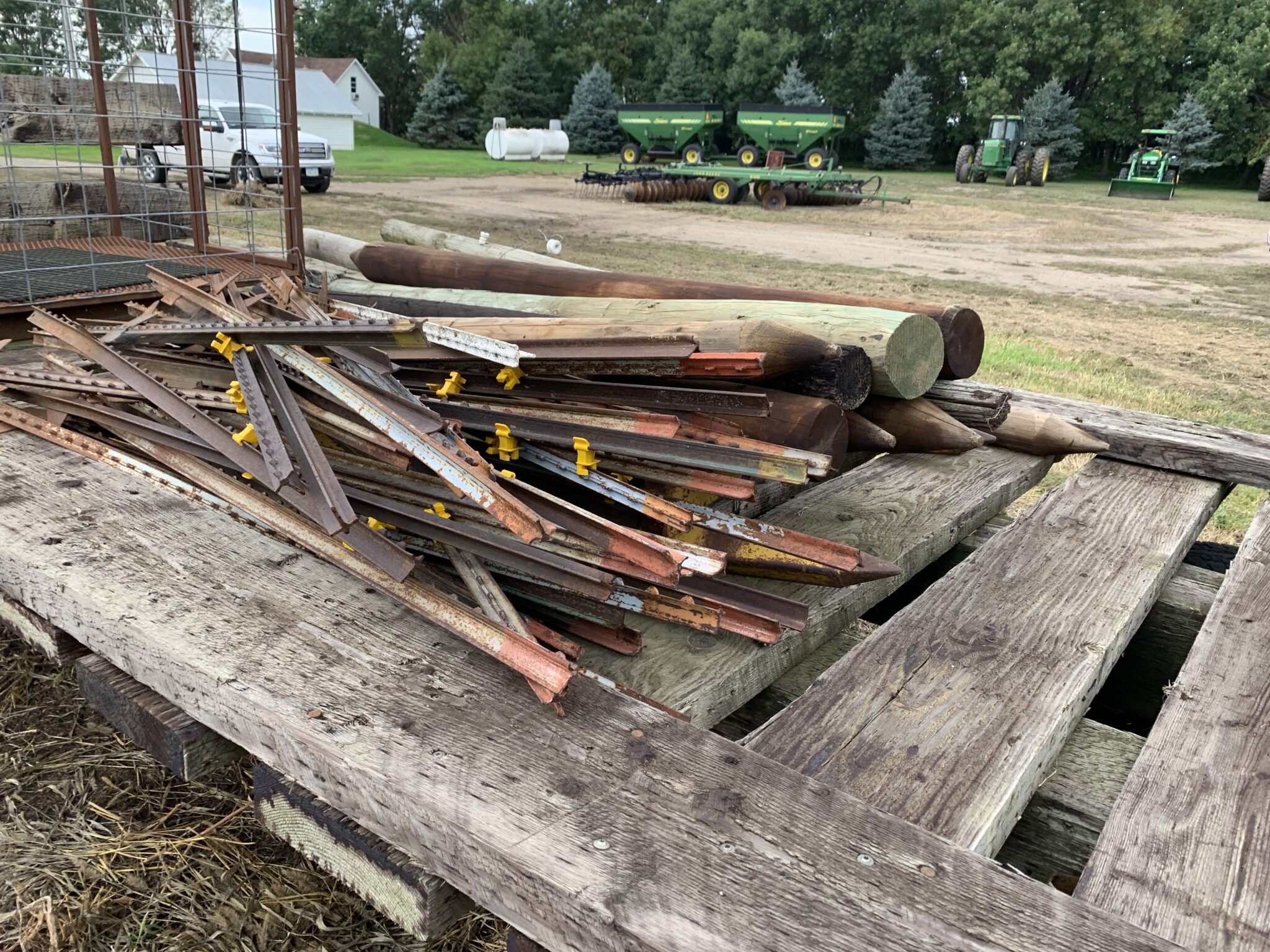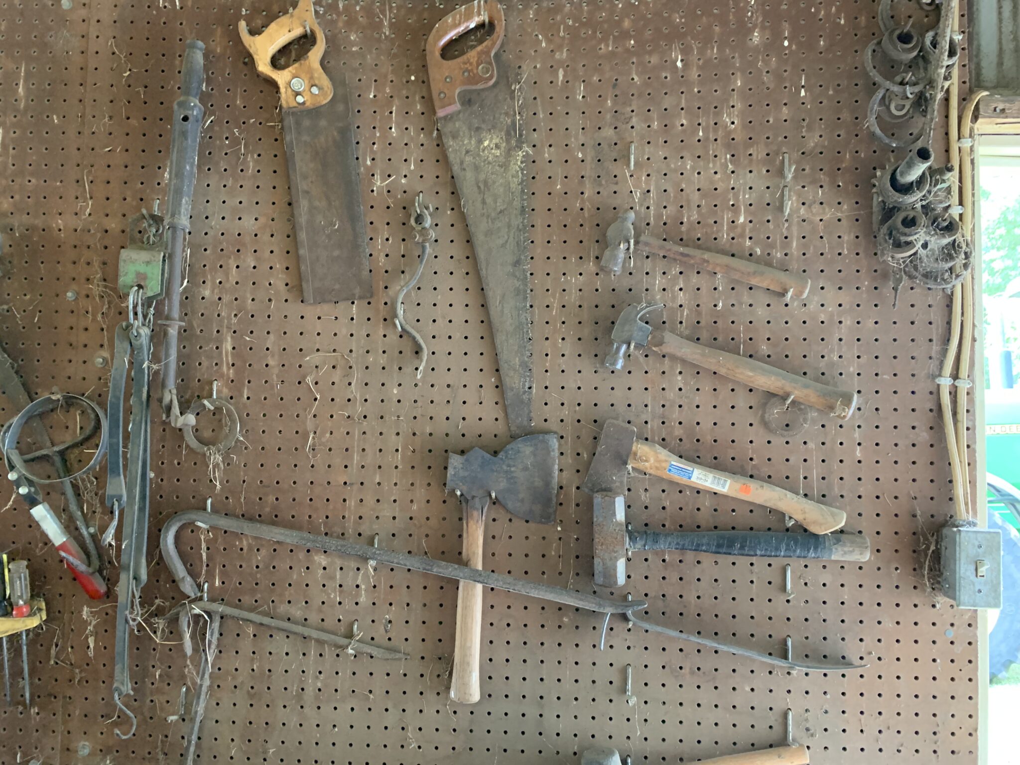 Tools: Craftsman 150PSI 33 gallon air compressor: post pounder, post hole digger, pitch forks: saws: wrenches: metric socket set: punches: files: Lesota elec drill: assort of nuts/bolts/screws: