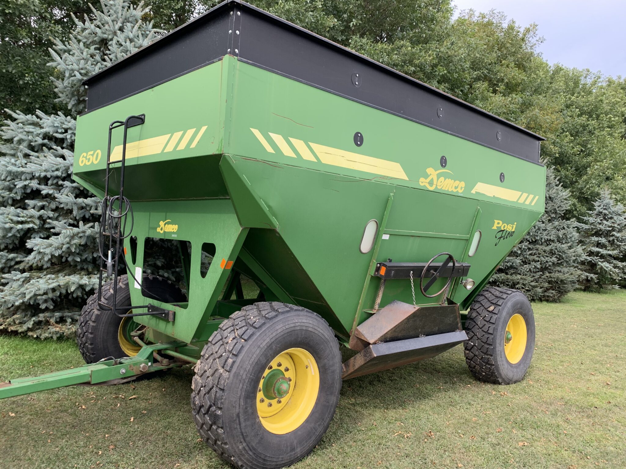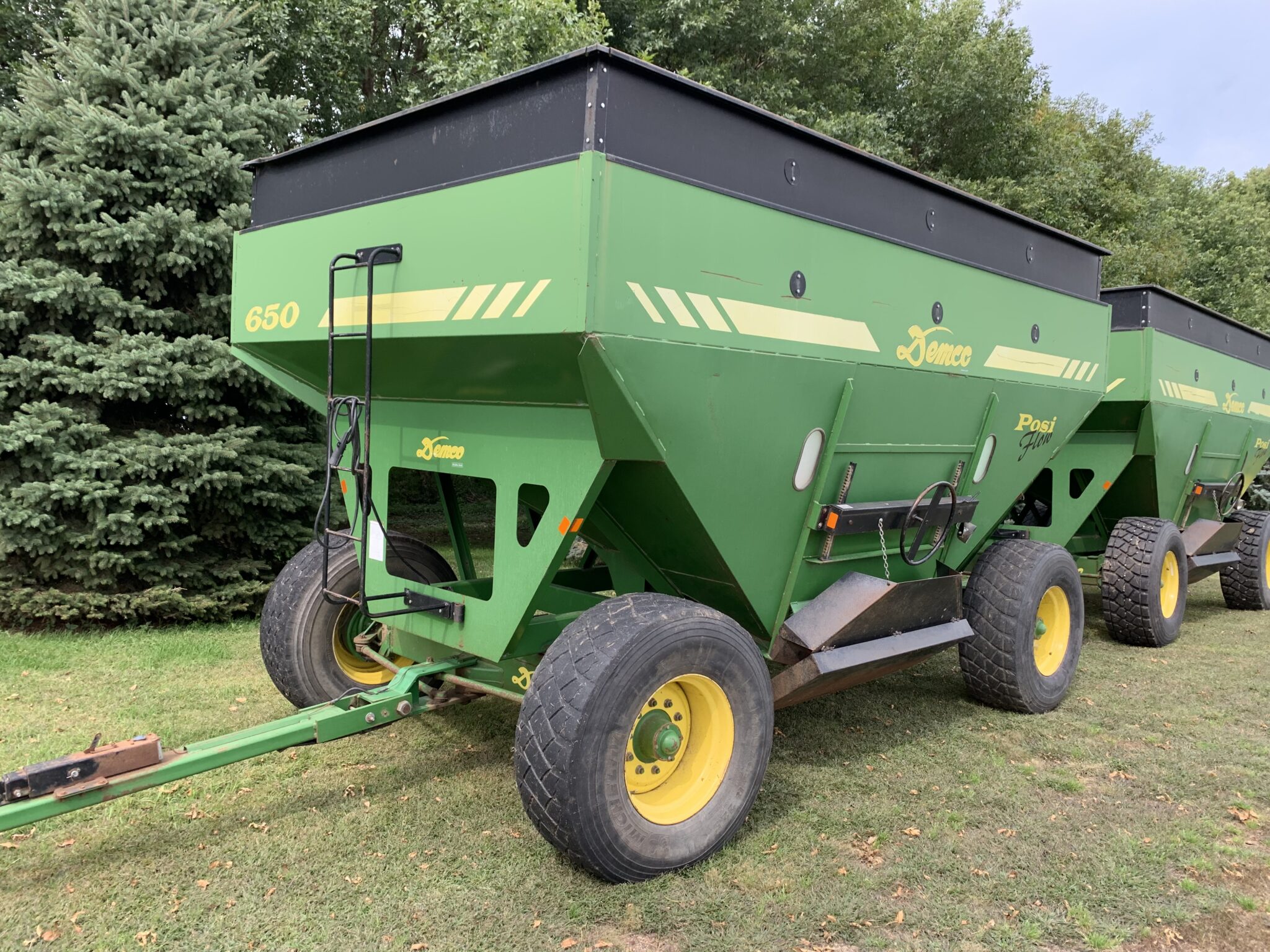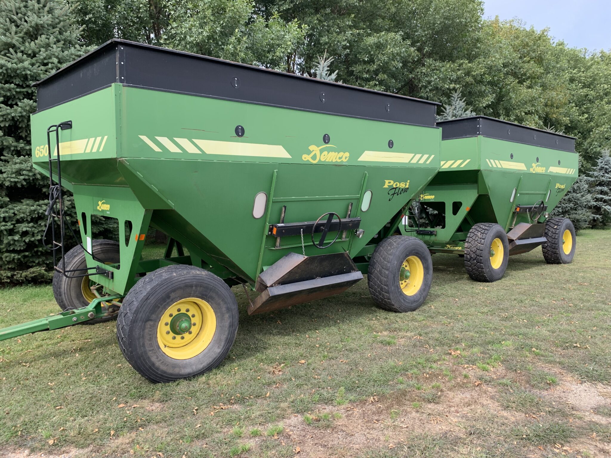 Gravity Wagons: 2—-Separate Demco 650bu. Posi Flow Gravity Wagons-front/rear brakes, 445/65R22.5 tires, lights, side/center unload: J&M 250bu. Gravity wagon-J&M gear, 11L15 tires: M&W 300bu. Gravity Wagon-12.5-15 tires: Parker Model 2000 Gravity Wagon—Westendorf gear, 12.5-15 tires, Demco 325bu. Gravity Wagon—Demco gear, 285/75R24.5 tires: