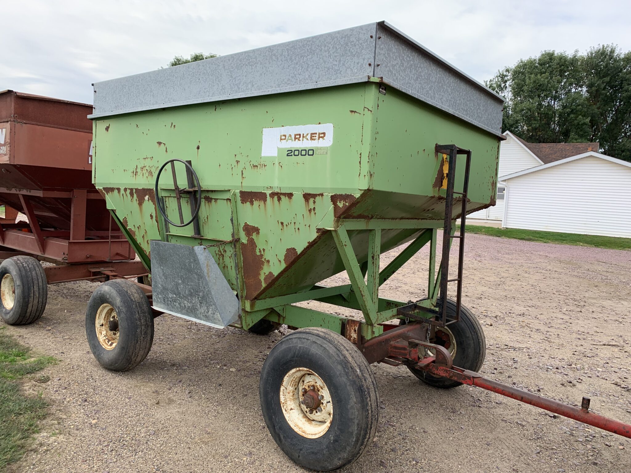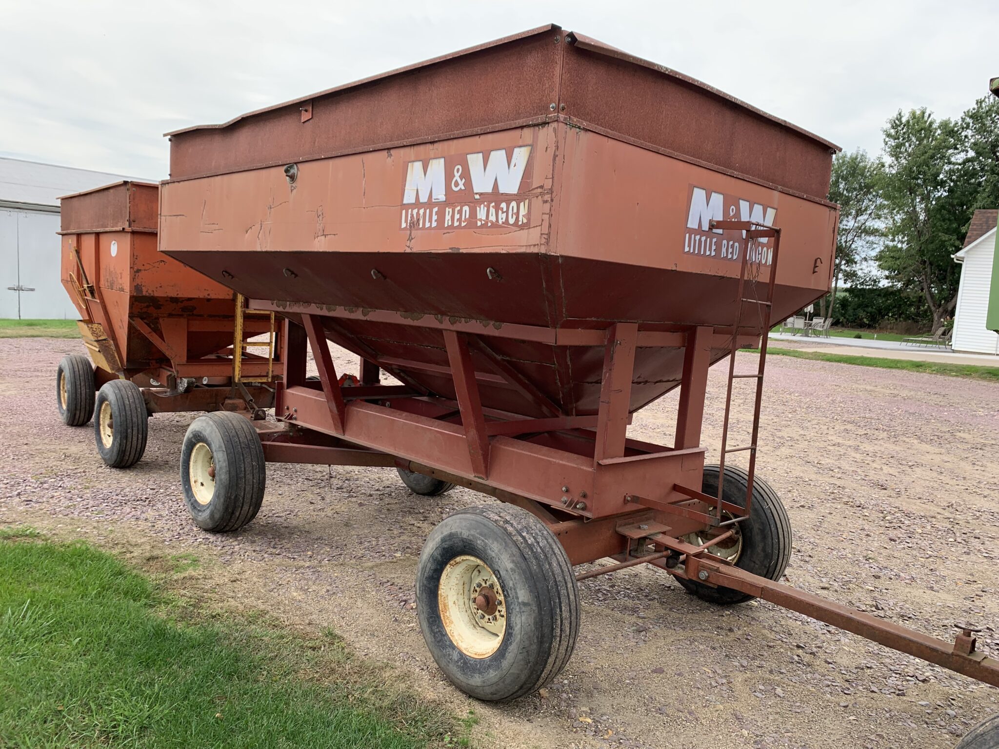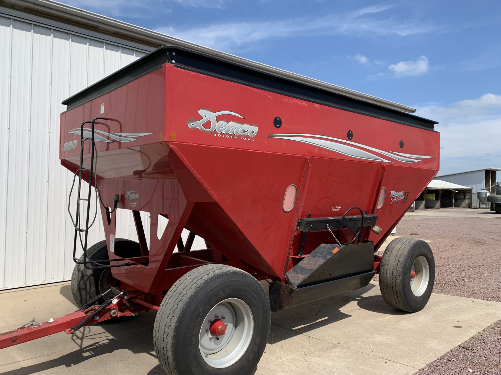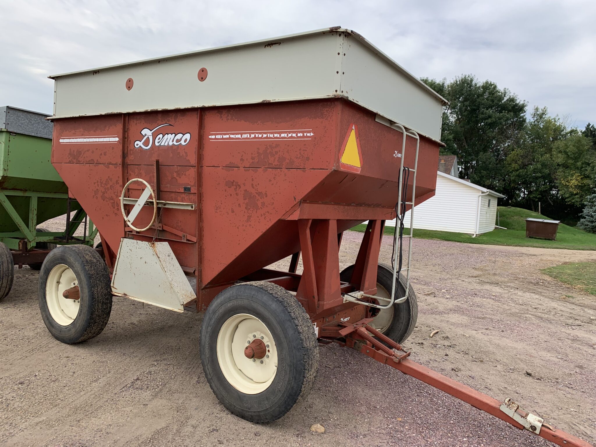 Gravity Wagons: 2—-Separate Demco 650bu. Posi Flow Gravity Wagons-front/rear brakes, 445/65R22.5 tires, lights, side/center unload: J&M 250bu. Gravity wagon-J&M gear, 11L15 tires: M&W 300bu. Gravity Wagon-12.5-15 tires: Parker Model 2000 Gravity Wagon—Westendorf gear, 12.5-15 tires, Demco 325bu. Gravity Wagon—Demco gear, 285/75R24.5 tires: