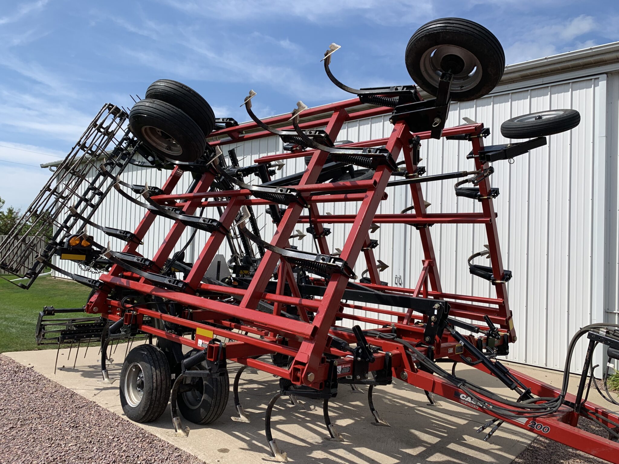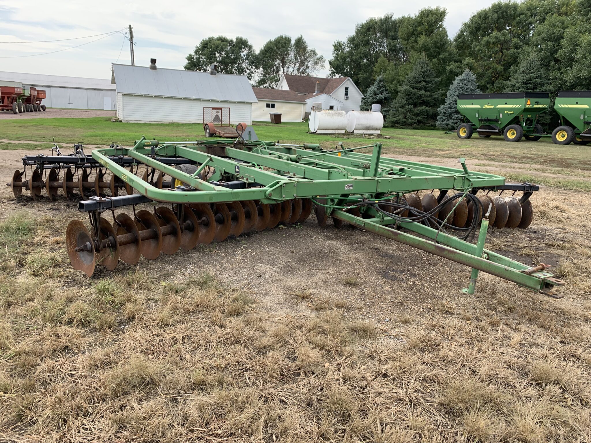 Tillage: John Deere 230 22’ Disk—SN-032711, 3 bar MH1104 harrow, hyd fold, front 21 1/4”, rear 19 1/4”: Krause 13’ 2860 9 Shank Disk Chisel—20 1/2” front blades: