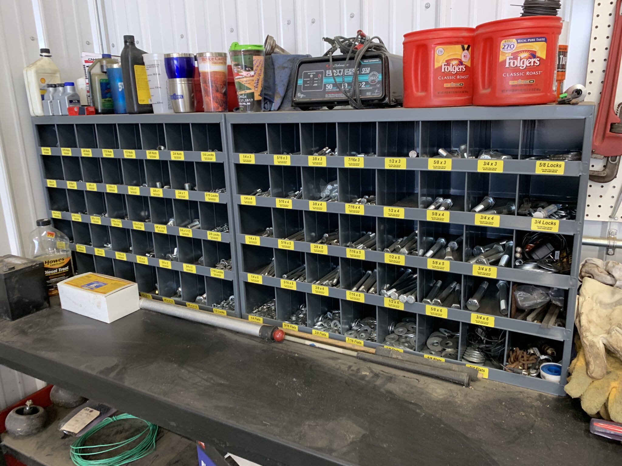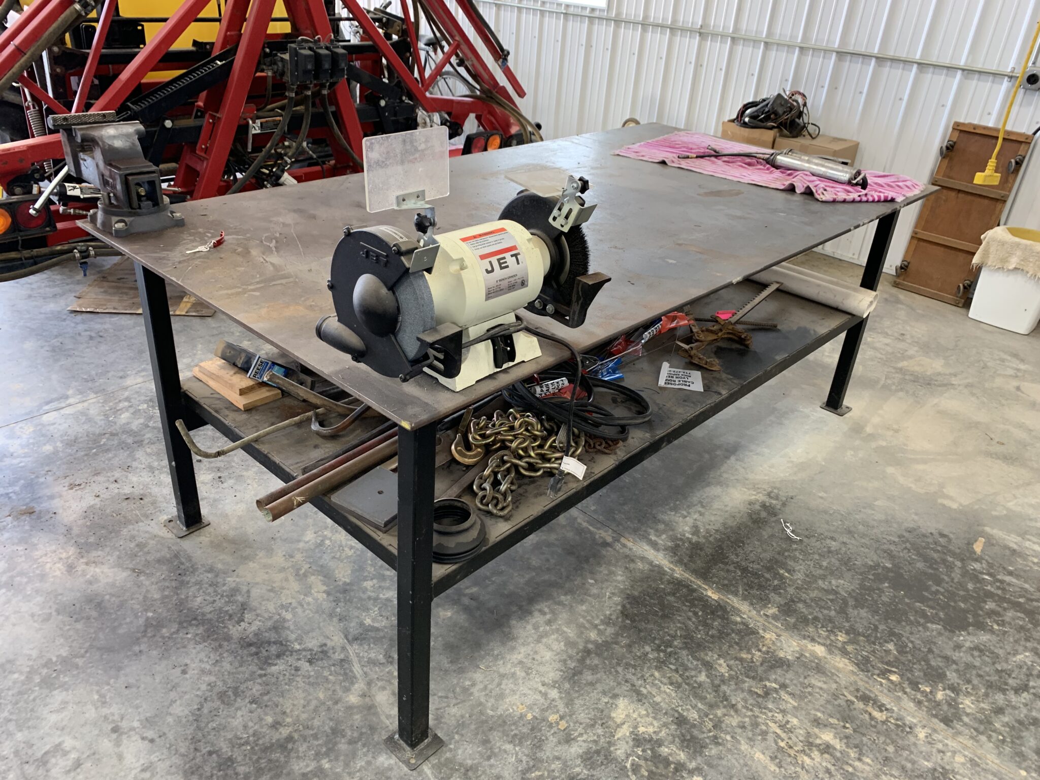 Tools: 4’x8’x3’T steel work table: log chains: 2—table top bolt bins: bolt cutters, 20 ton bottle jack, Dewalt 14” chop saw: Craftsman 6HP 33 gallon air compressor: air tanks: misc tools: