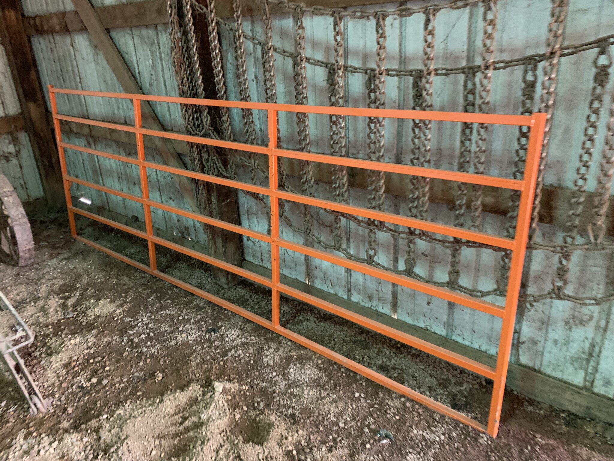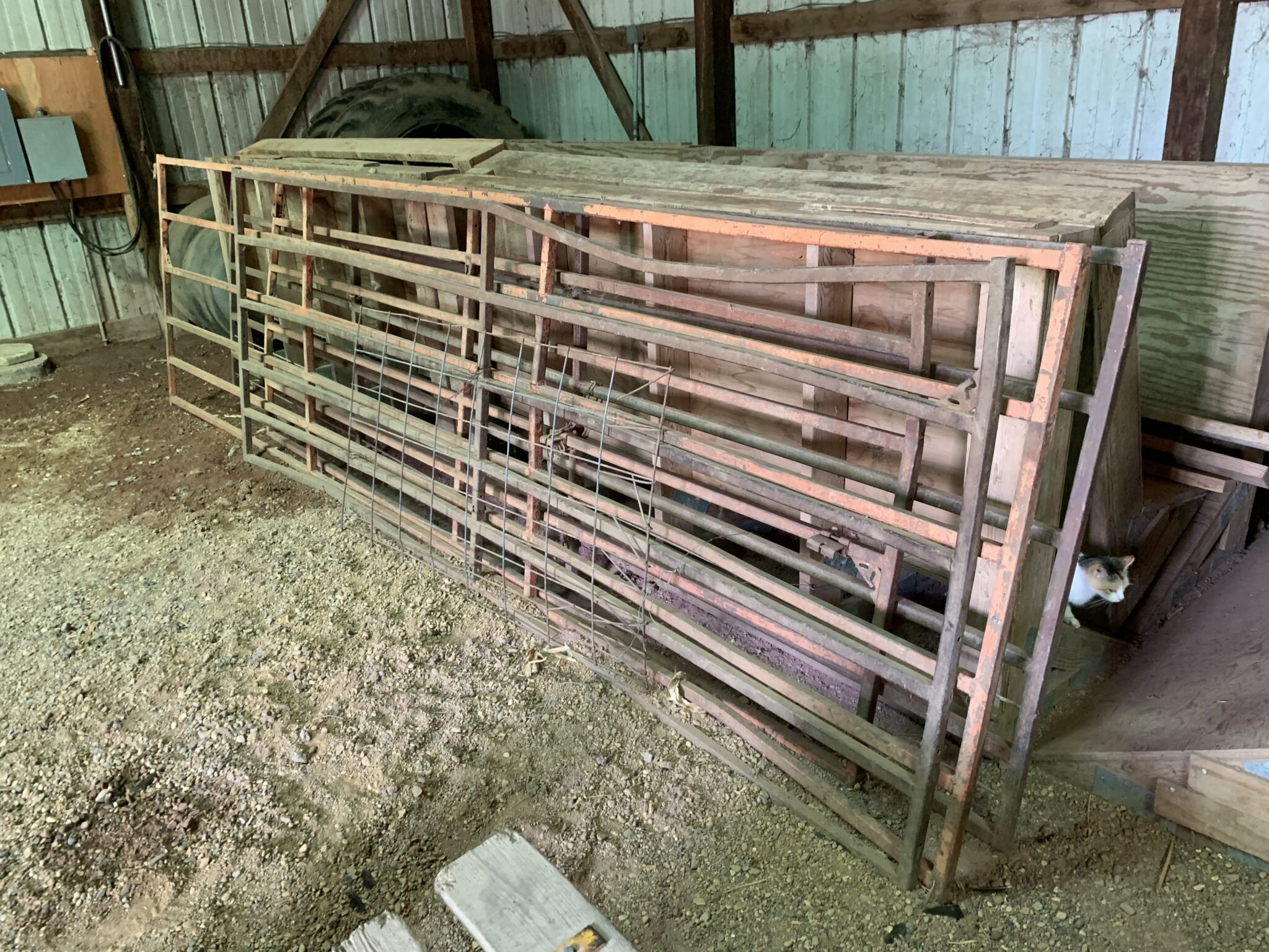 Livestock Equipment: 11’ Portable wooden loading chute: 3 ton bulk bin w/ bucket slide: fence-line bunk cable holders: lg assort of fencing supplies: misc livestock gates: