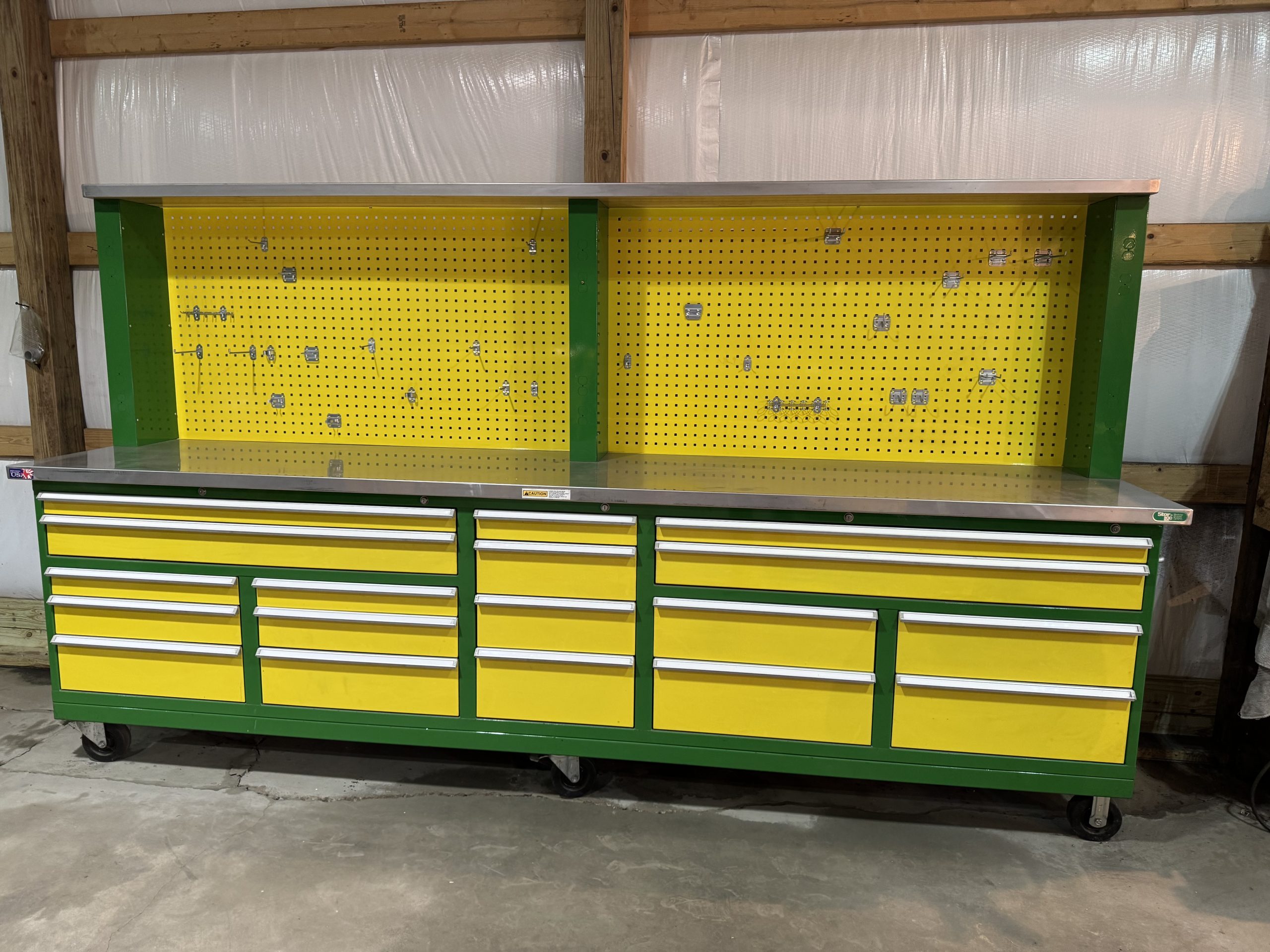 Tools & Misc: 30” x 142” 18 drawer rolling tool chest with pegboard back: air hose, threader kit, 2—NEW 235/85R16 tires, Remington & Poulan chain saws, JD wheel weights, Dewalt elec grinder, JD tractor parts: craftsman socket set, wrench sets—metric & standard: 2—7.50-16 front tires w/ 6 bolt rims, 14—100# JD front suitcase weights, 8—40# JD suitcase weights Firestone 20.8-38 tire: Briggs & Stratton transfer pump: Plastic Pickup Tool Box: set of tractor rims—23 inch wide x 40 1/4 inch diameter: set of tractor rims; 23 1/4 inch wide x 40 inch diameter, 10 bolt