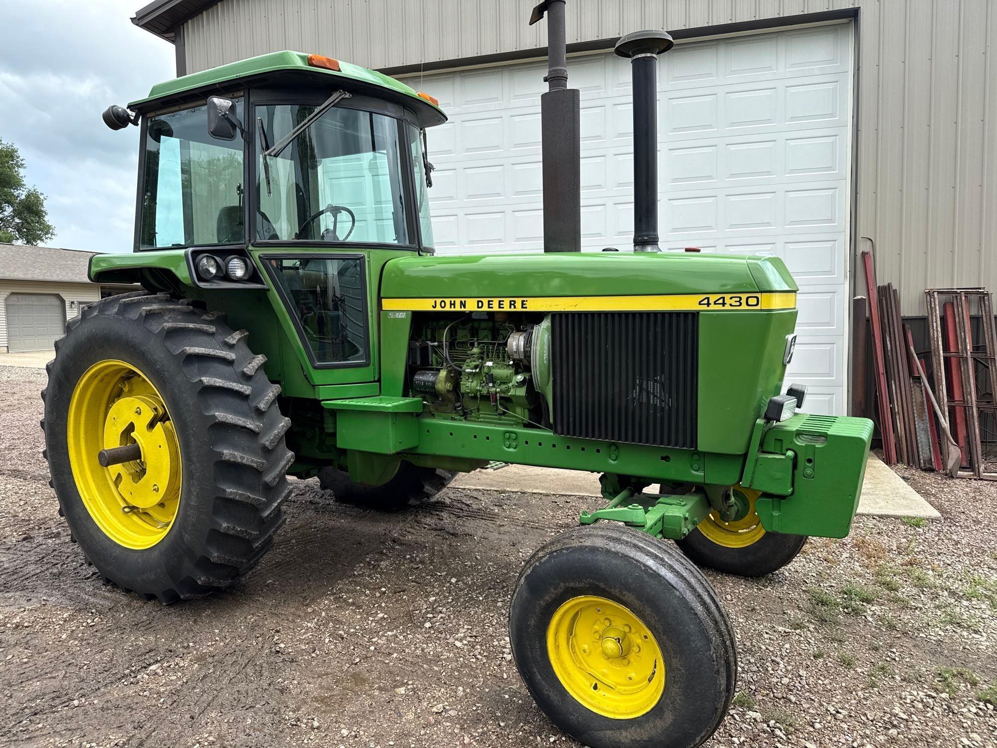 1976 John Deere 4430 2WD Diesel Tractor—SN:055334R, shows 9,536 hours, quad range transmission, 2 remotes, 8 front suitcase weights, 3 sets of rear wheel weights, tractor was overhauled in April of 2022, 18.4-38 rear tires, heat, a/c, radio, 540/1000 pto, 3pt with 3rd link, in 2022 this tractor had an inframe overhaul(less than 200 hours on the overhaul Click Here For Invoice