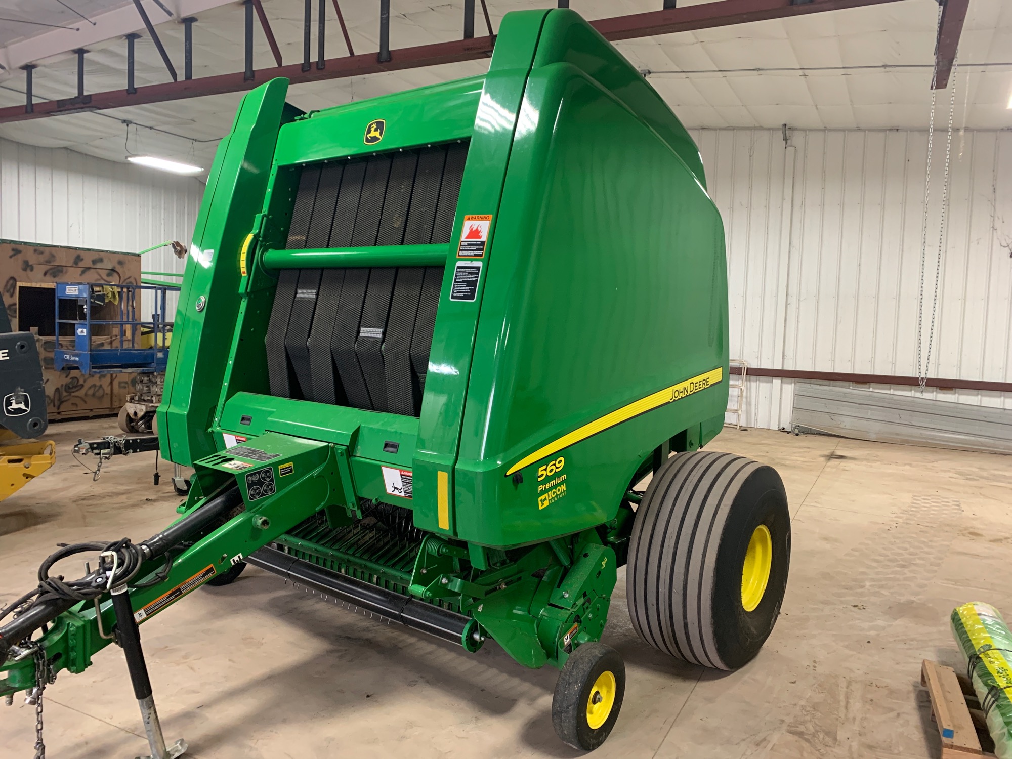 Baler: 2013 John Deere 569 Premium Round Baler—1 Owner— Sn-1E00569DJDD390435, shows 7242 bales and 227 hours, 6 1/2 ft pickup, 21.5-16.1 tires, hydraulic pickup lift, mega wide plus with gauge wheels, surface wrap, bale push bar, lights, super sharp baler, stored inside :