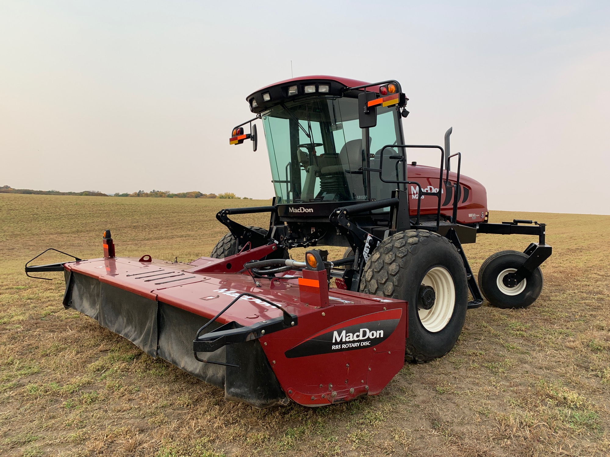Self Propelled Windrower: 2012 MacDon M205 Self Propelled Windrower With R85 16ft Rotary Disc Header-1 Owner — 295 engine hours, 188 cutter hours, 2672 total acres, Sn- 217378-12, MacDon R85 Rotary disc 15 1/2ft head, 23.1-26 front turf tires, 16.5-16.1 rear tires, Cummins engine, dual direction, heat, radio, a/c, super sharp machine :