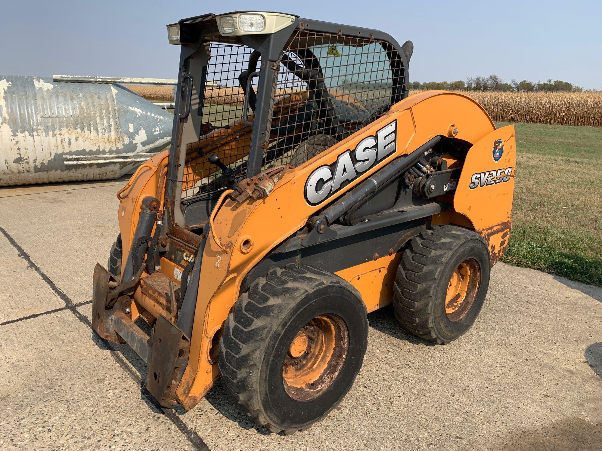 Skidloader: 2014 Case SV250 Construction Skidloader–Sn-jafsv250cem469727, shows 931 hours, hand controls, cab, no door or side windows, manual quick tach plate, galaxy 12×16.5 Tire’s, aux hyd, 2 speed hydrostatic drive motors, runs/operates