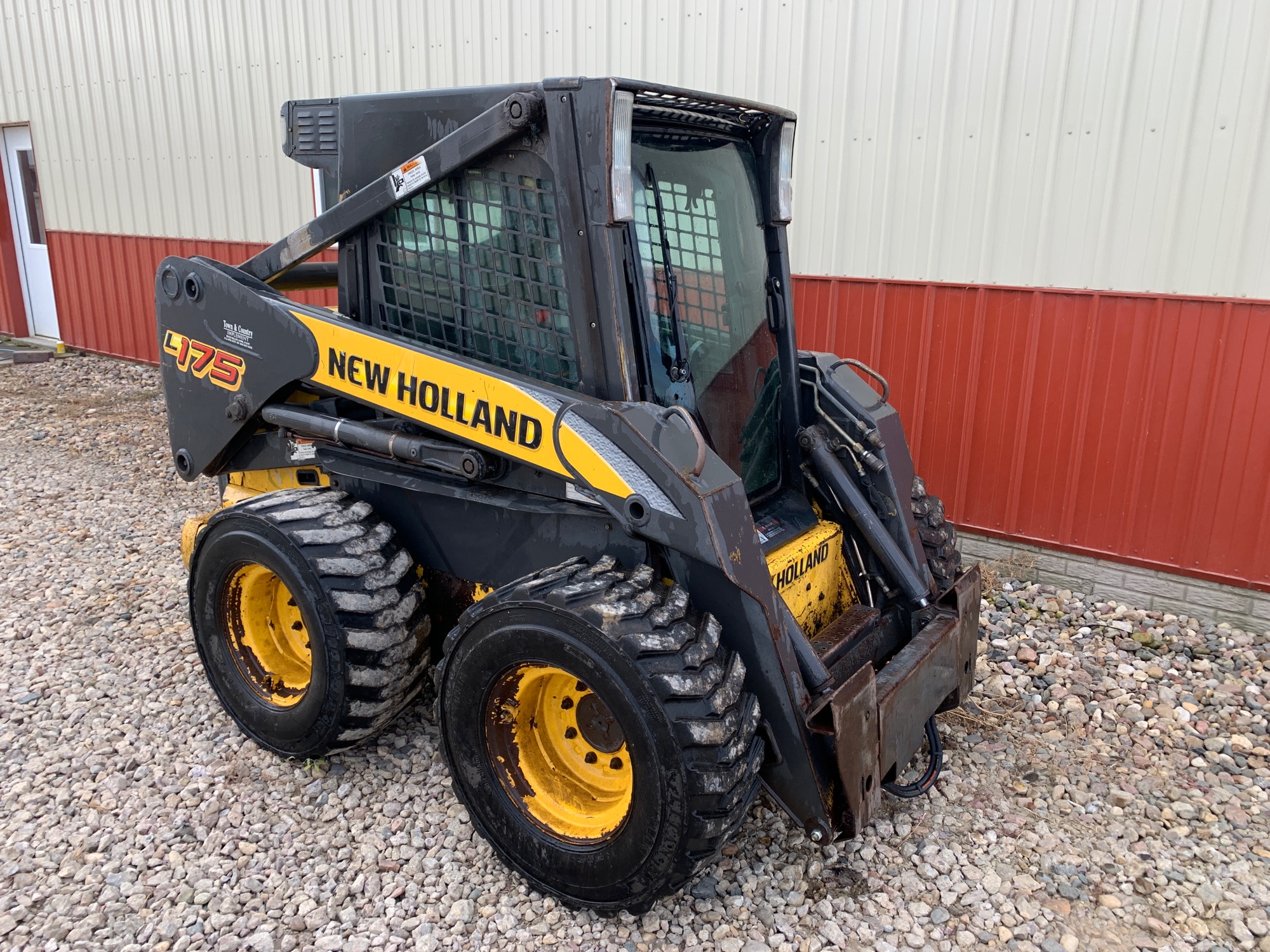 Skidloader: New Holland L175 Skidloader–Sn-N8M492381, shows 6220 hours, 12.5-16 tires, 2 sets of rear weights, hyd quick tach, 2 speed, full cab with door.