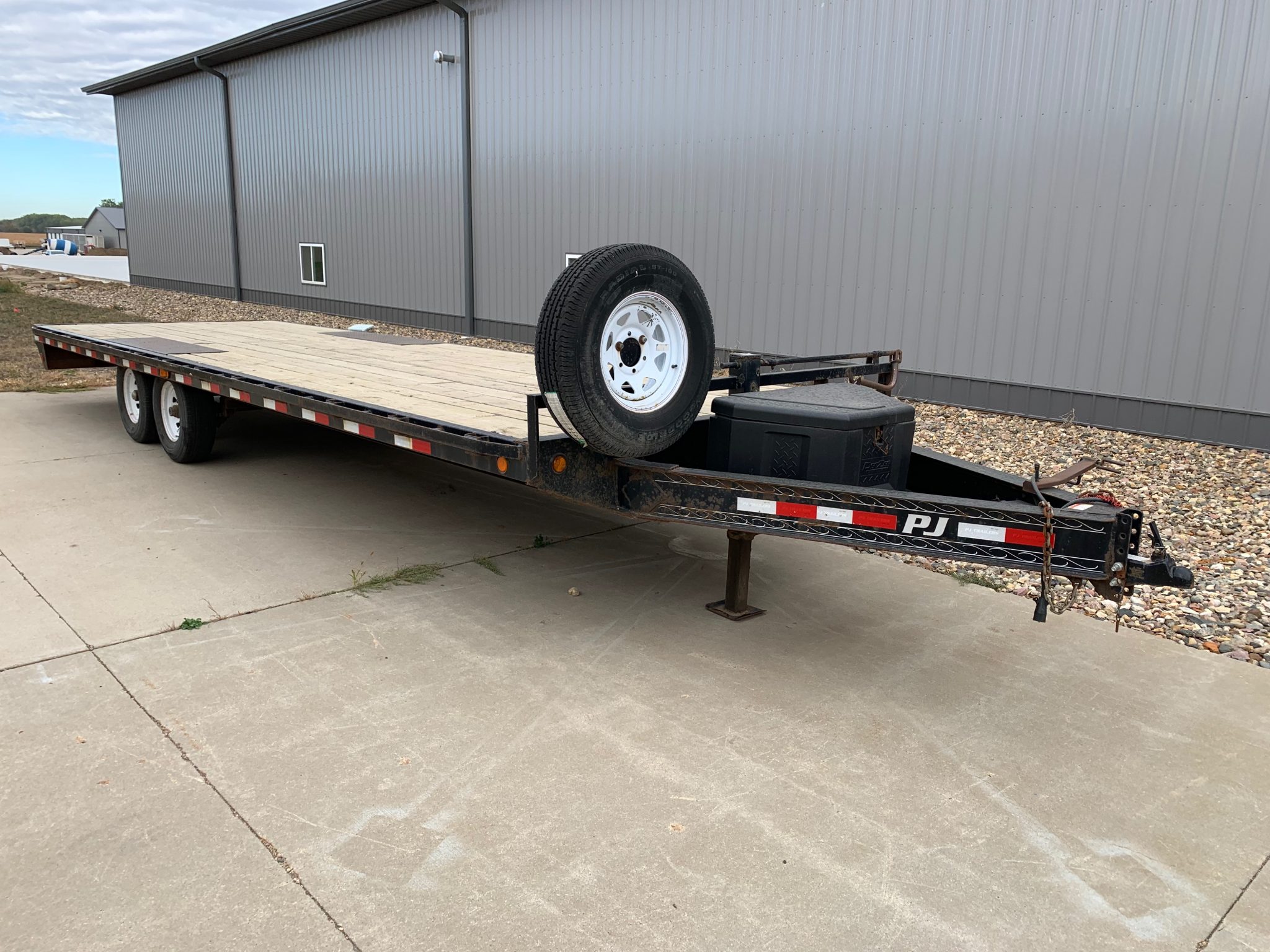 Trailer: 2017 PJ 26ft Deckover Flatbed Trailer–1 Owner–VIN- 4P5F8262XH1269531, twin 7,000# Dexter axles, 2 5/16″ ball, pull out ramps, 235/80R16 tires, 96″ inside deck width, 100″ outside rail to outside rail, spare tire, elec brakes, lights and brakes all work, good trailer: 10ft alumunim 2 wheel trailer: