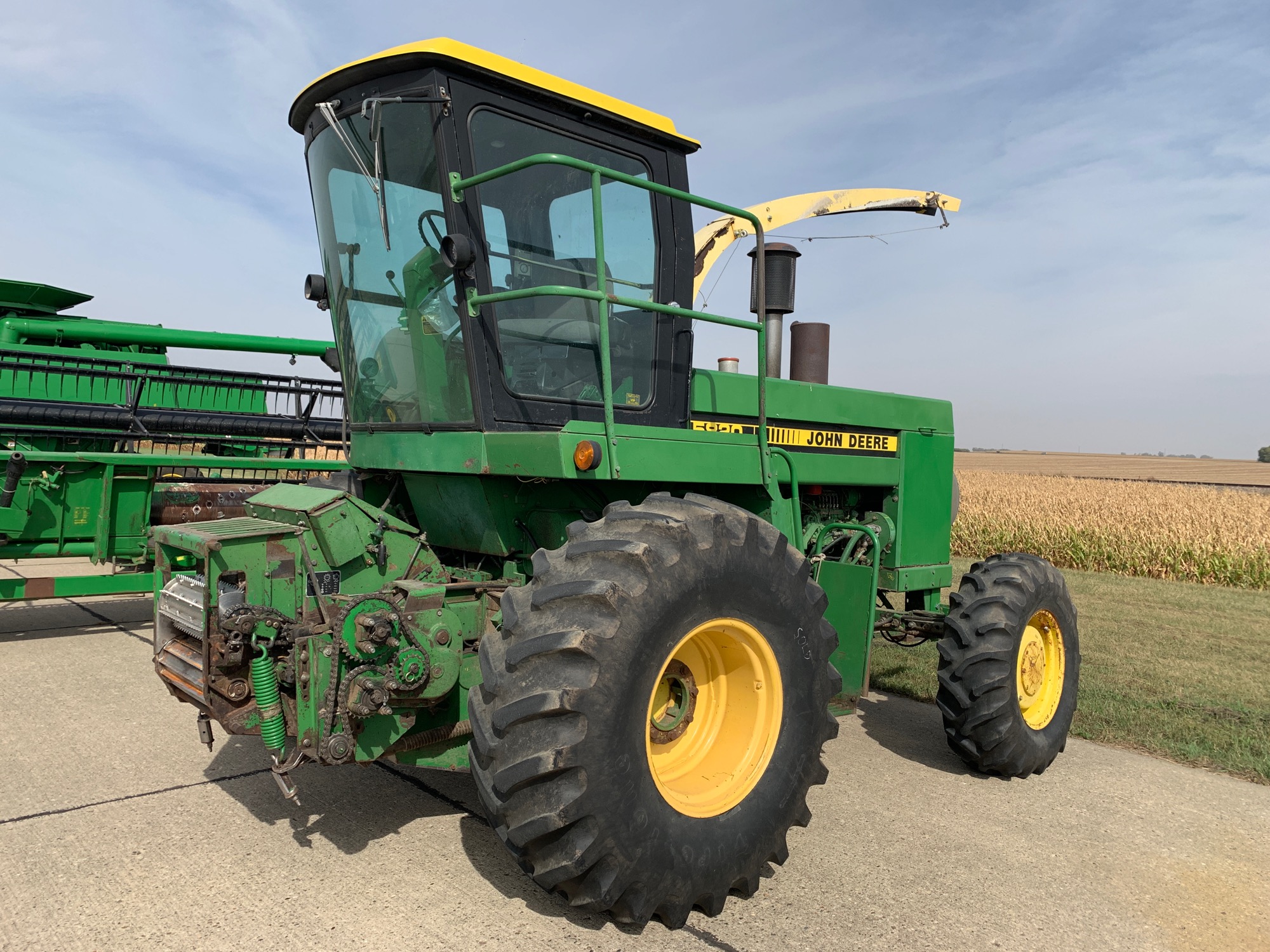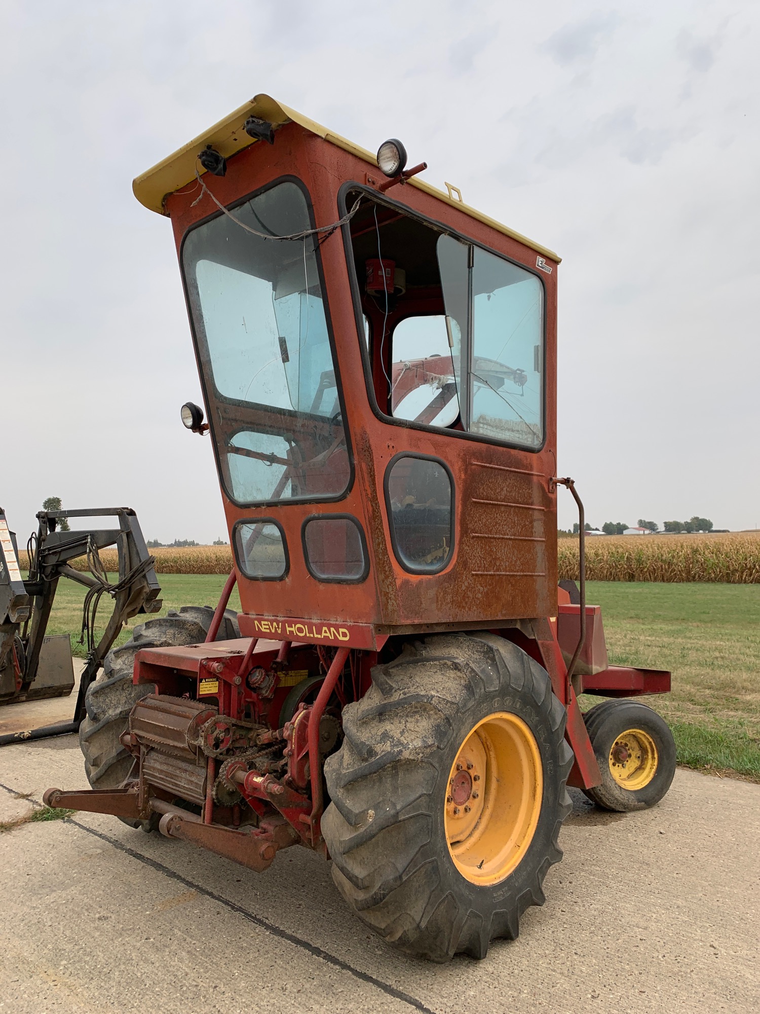 Forage Harvestors: John Deere 5820 Self Propelled Forage Harvestor—SN-578758, shows 4030 hours, 23.1-26 fronts, 14.9-24 rears, hyd spout, rear hitch, runs/drives: New Holland Self Propelled Forage Harvestor—NOT running, 3208 CAT eng, 18.4-26 front tires, 11L-14 rear tires, as is: