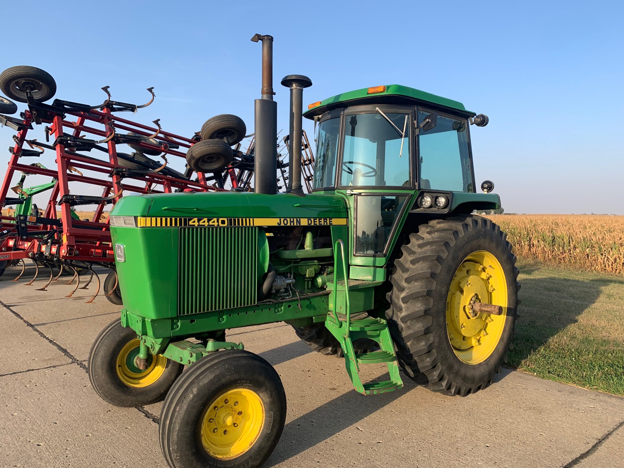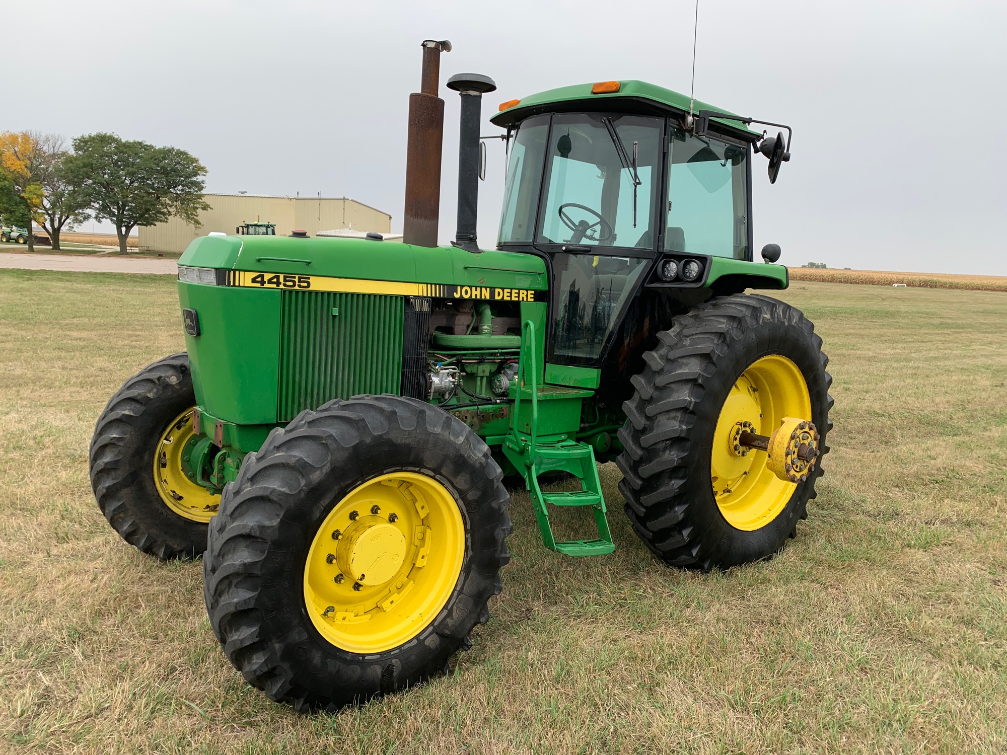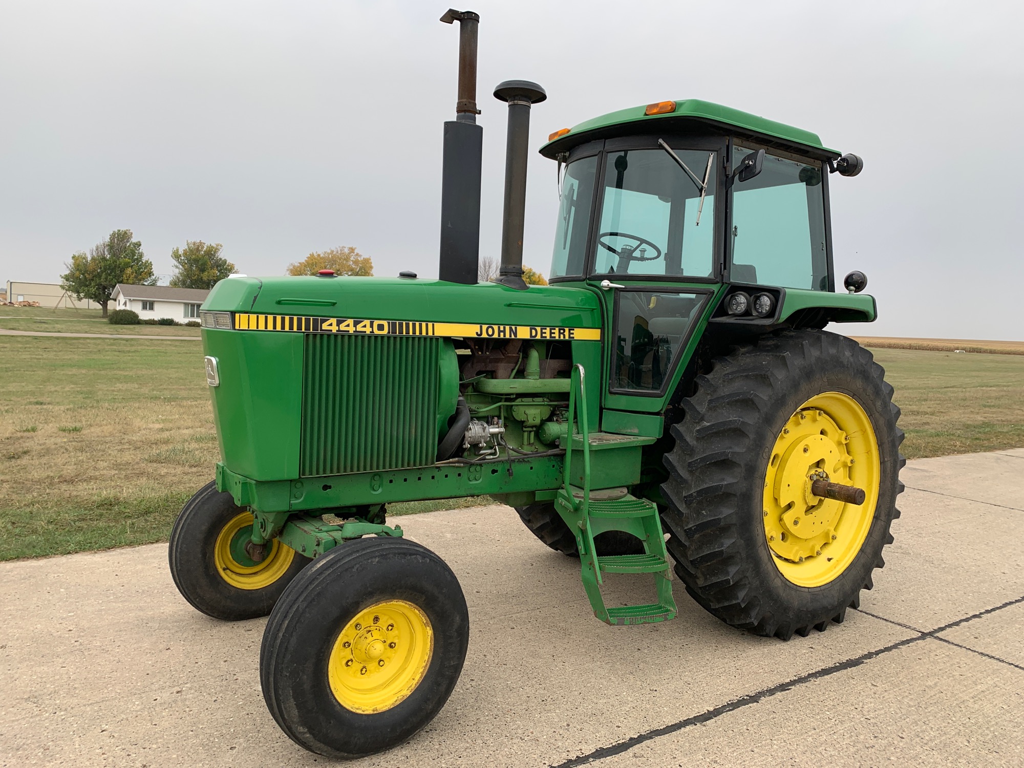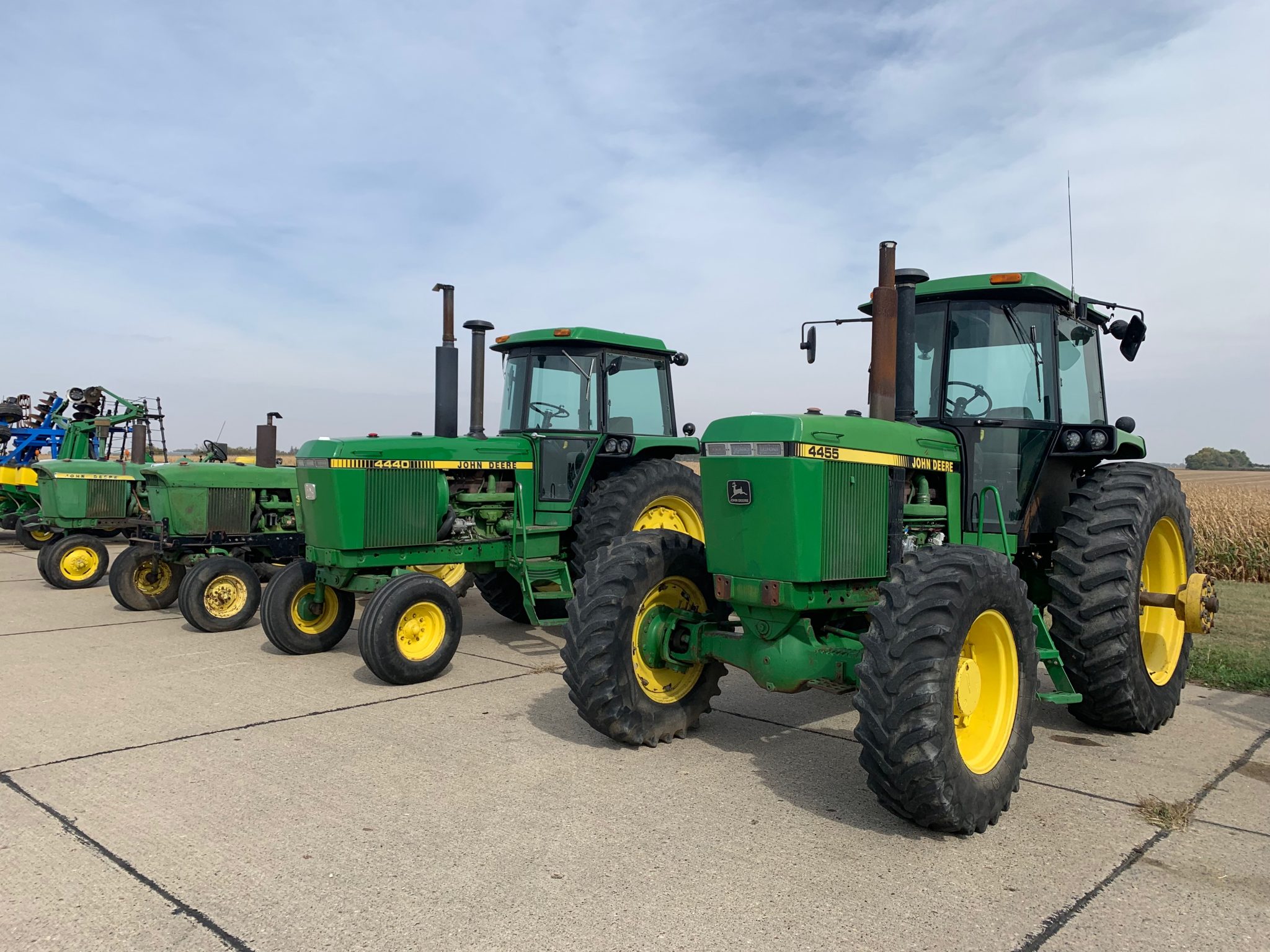 Tractors: John Deere 4455 FWA Tractor—SN-RW4455P008966, shows 11,000 hours, 3pt, 3 remotes, 15 speed powershift, 540/1000 pto, 1 set of rear 225kg wheel weights, 10 bolt hubs(no duals), side step, heat, a/c, radio, Firestone 14.9R38 fronts, Firestone 18.4R42 rears: John Deere 4440 Tractor—SN-4440H049288R, shows 57 hours(10,057 hours), quad shift, 3 pt, 3 remotes, 540/1000 pto, Firestone 18.4R42 rears, side step, radio, heat, a/c, 1 set of rear wheel weights, clean tractor: John Deere 3020 Diesel Tractor—SN-T113-131550R, shows 500 hours(not actual), synchro, 2 remotes, 3pt, 540 pto, 15.5-38 rears, 1 set of rear wheel weights, wf, fenders: John Deere 3010 Diesel Tractor—SN-T31047, hours unknown, (no tach), synchro, 15.5-38 rears, cement rear wheel weights, nf, fenders, 2 remotes, 540 pto, 3 pt: