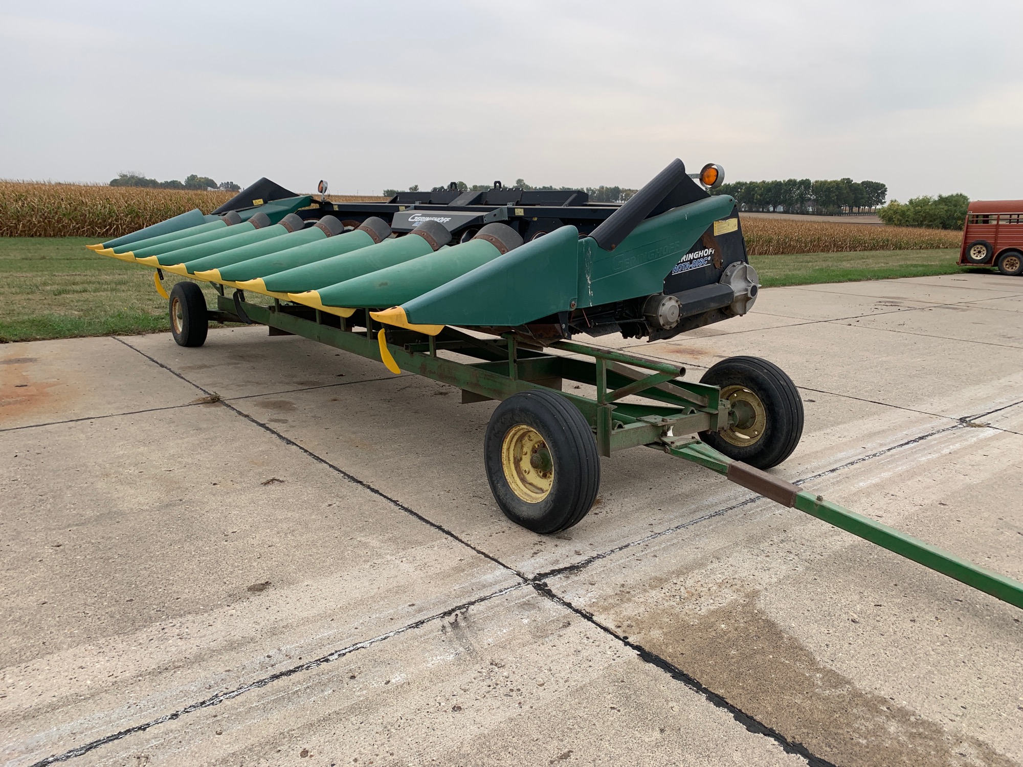 Corn Head: 2007 Geringhoff 8rw30 Rotadisc Corn Head—-1 owner, Sn-93437830/B, single point hookup, hyd deck plates, approx 2000 acres through the head, poly snoots, header height control, John Deere custom made head cart sold with the head