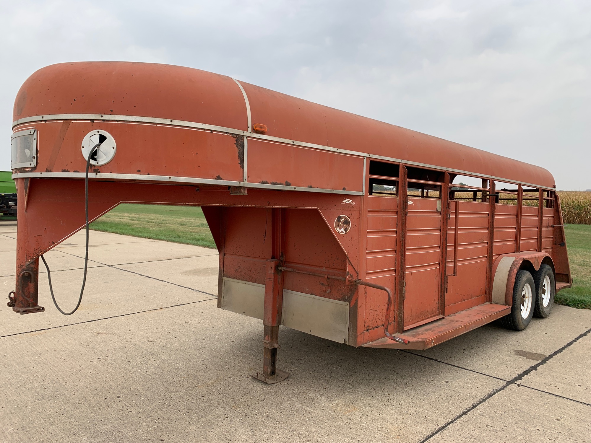 Livestock Trailer: 1982 Kiefer 6ft x 18ft Gooseneck steel livestock trailer—model SSG18, SN-2656, tandem axle, 245/75R16 tires, wood floor, center gate: