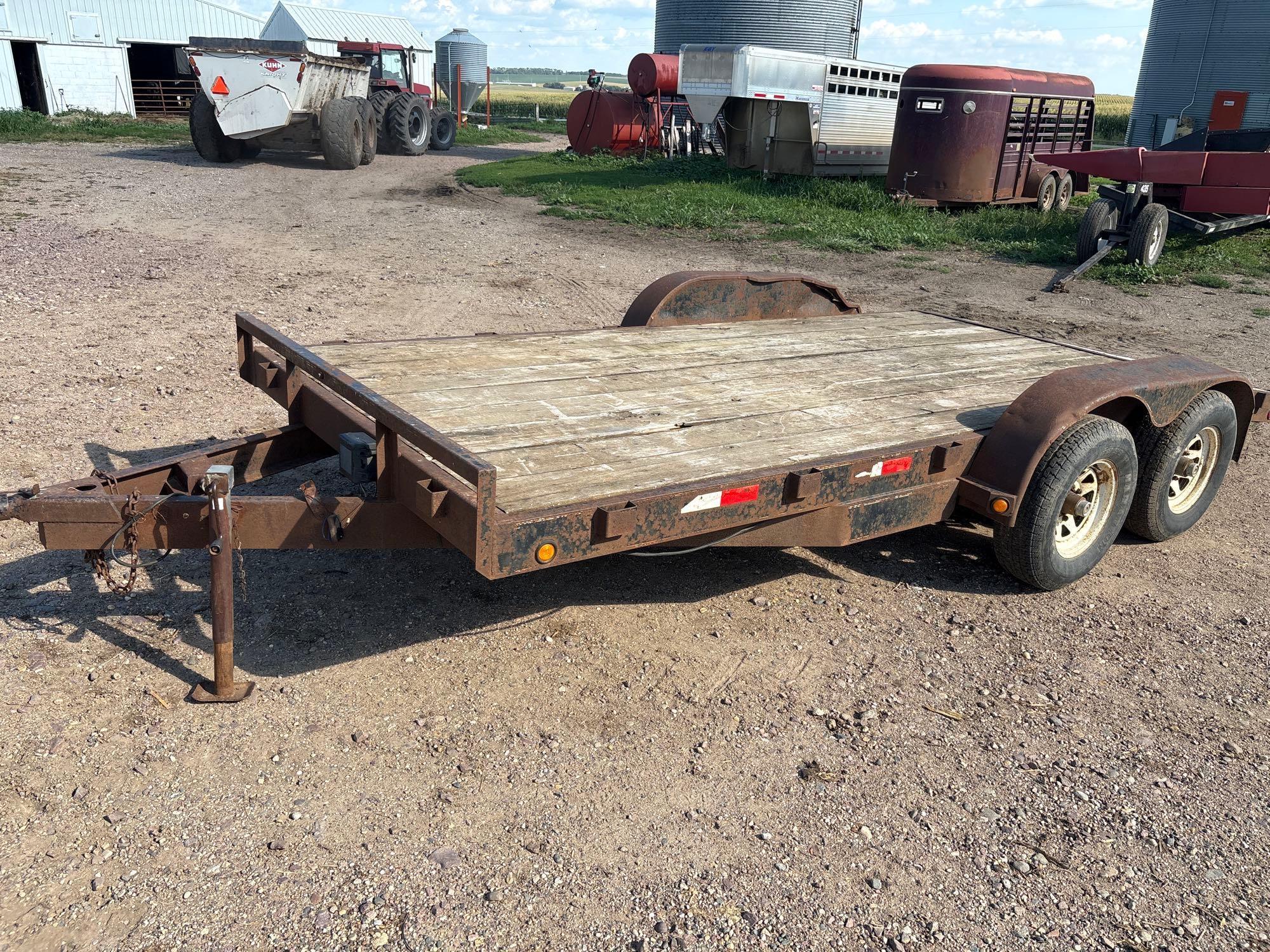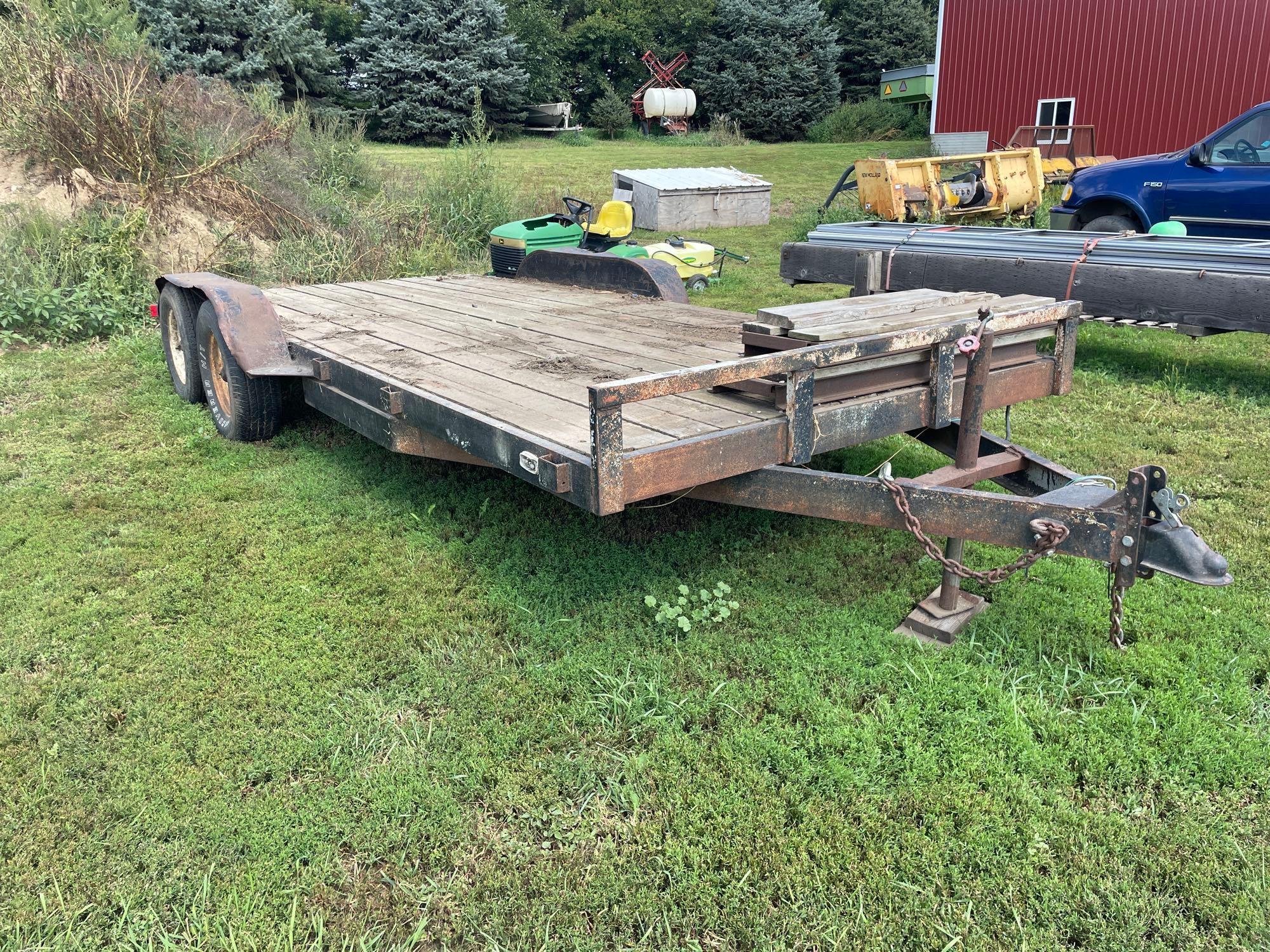 1999 Specially Constructed 82” x 18ft Bumper Hitch Flatbed Trailer–225/75R15 tires, new floor from doon saw mill approx 4 years ago, tandem axle, ramps included