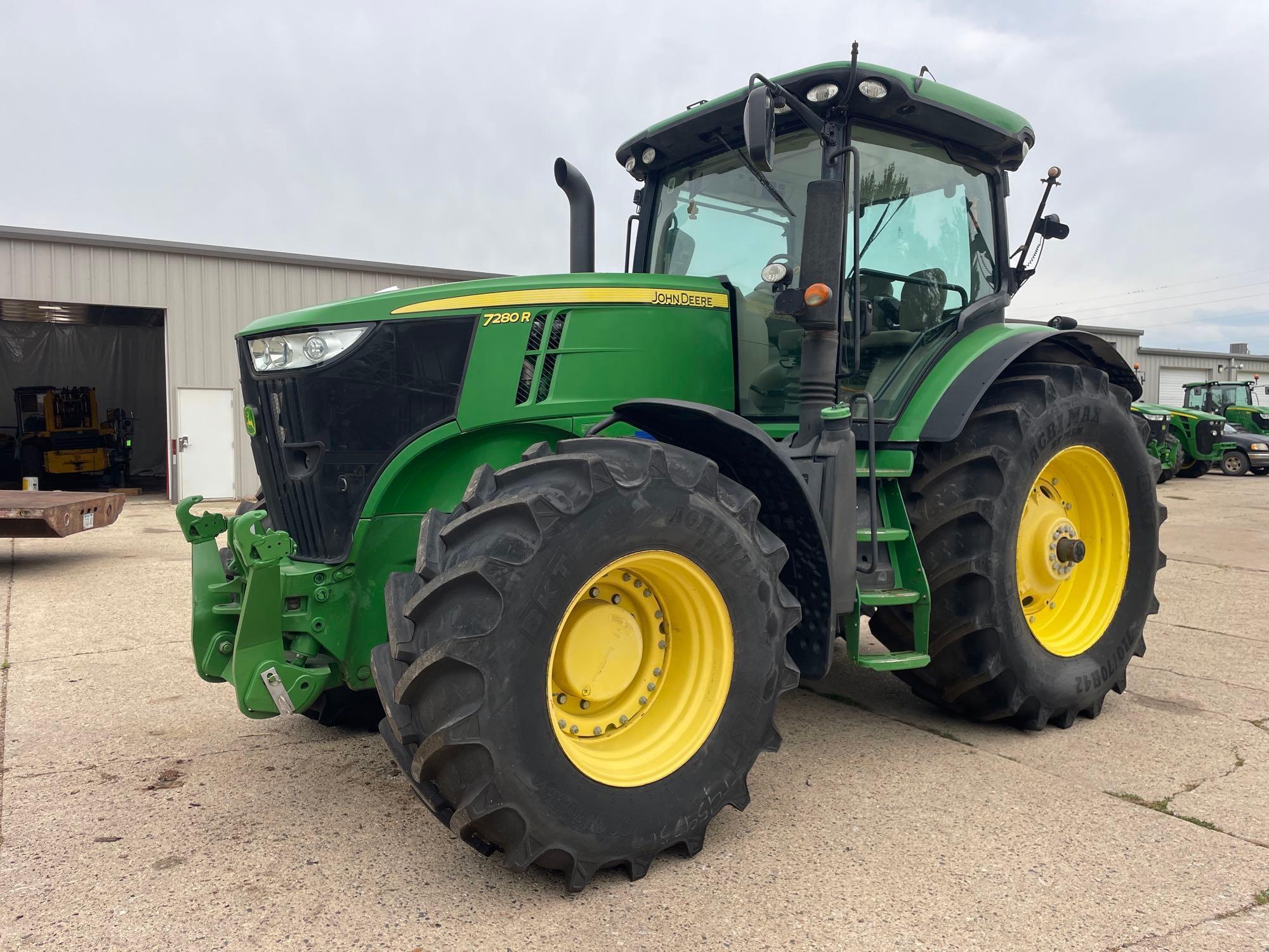 2012 John Deere 7280R MFWD Tractor–SN:1RW7280RECD, Shows 5919 hours, 4 remotes, 1000 pto, 3pt, quick hitch, NEW BKT 710/70R42 rear tires, NEW BKT 600/70R30 front tires, front fenders, buddy seat, left hand reverser, radio, heat/ac, IVT transmission, 280hp, 31mph