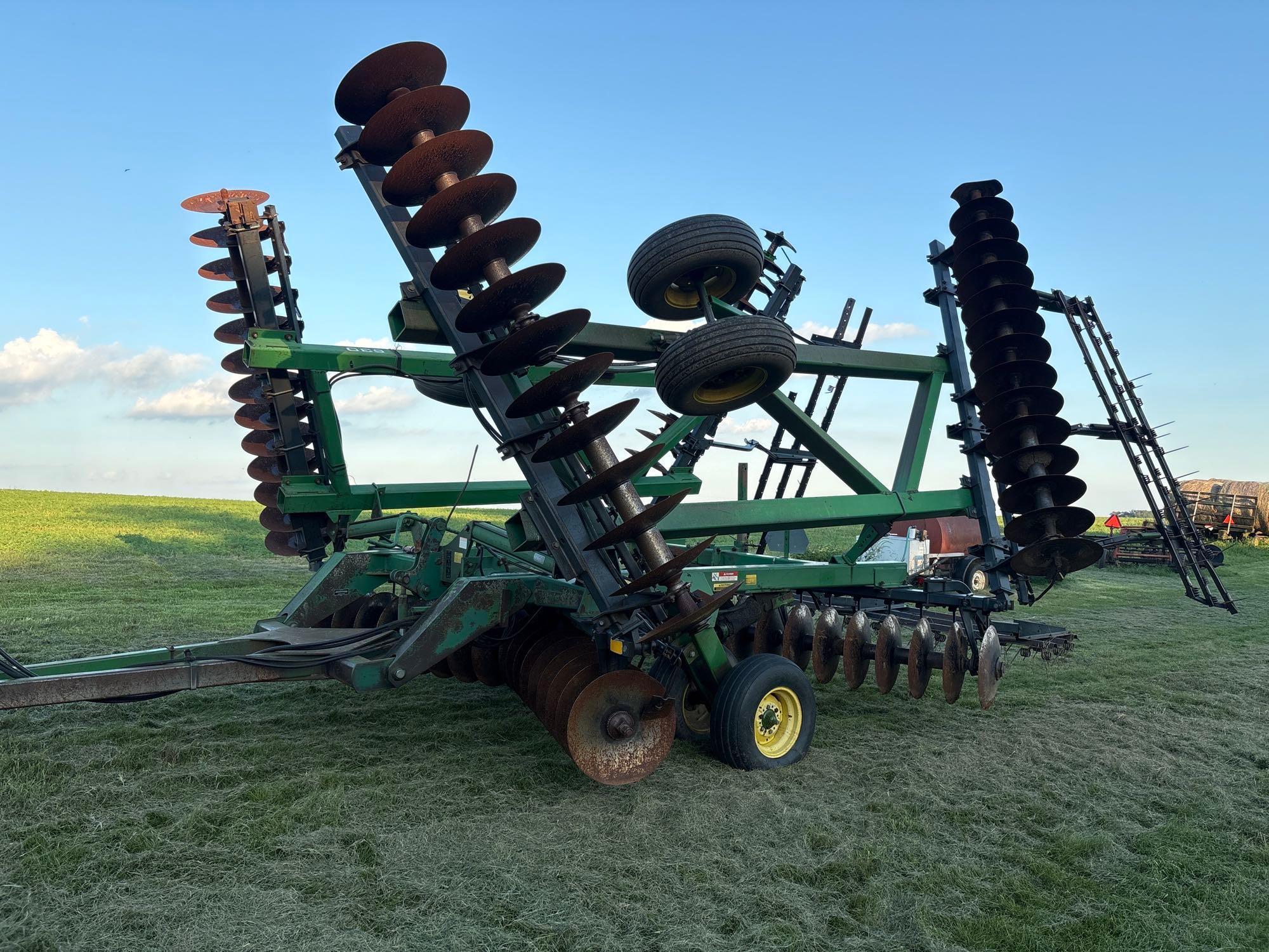 Disk: John Deere 630 32ft Disk–32’ wide, rear blades 22”, fronts blades are 22”
