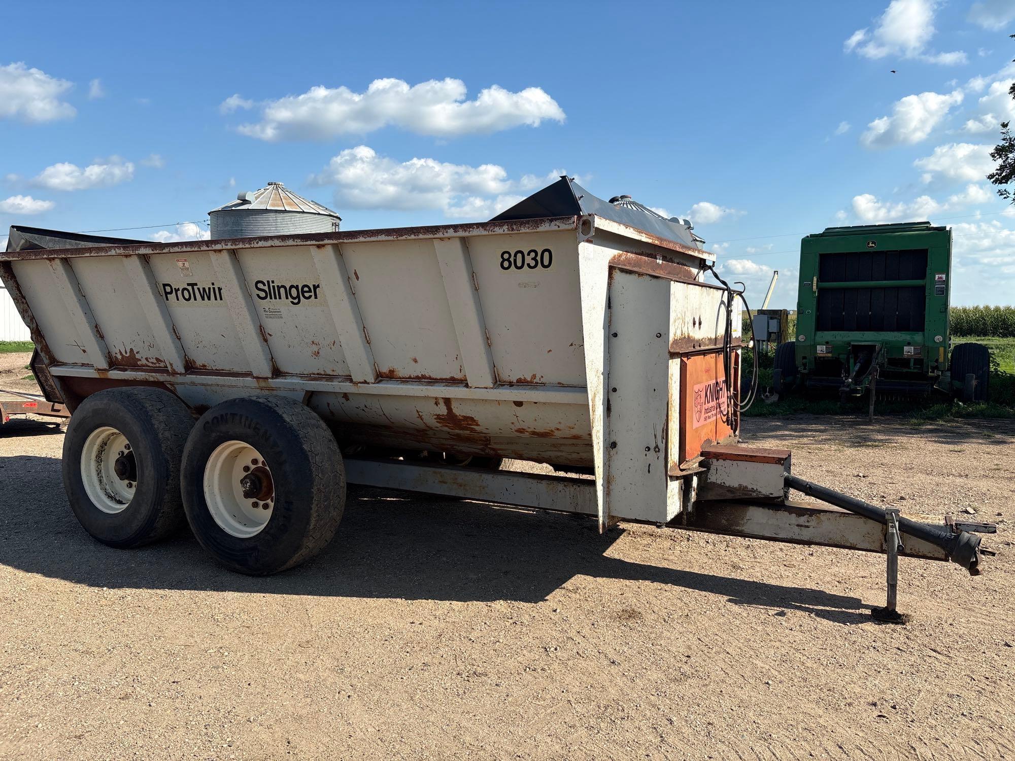 Pro Twin Slinger 8030 Manure Spreader–Hi Velocity, 425/65R 22.5 Tires, comes with large 1000 double knuckle pto, steel bottom, was gone through a couple years ago, works good.